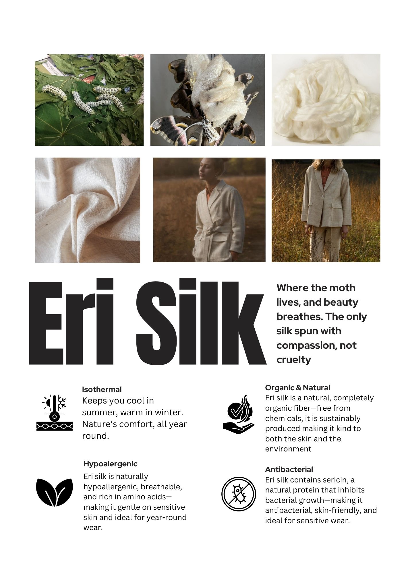 Eri silk contains sericin, a natural protein that inhibits bacterial growth—making it antibacterial, skin-friendly, and ideal for sensitive skin. Naturally hypoallergenic and organic, this waistcoat is a conscious choice for those who value both style and sustainability.