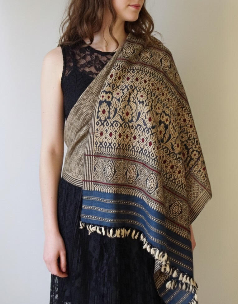 Material: 100% Eri Silk with Ghicha Silk Motifs Technique: Handloom Weaving | Natural Indigo Dye